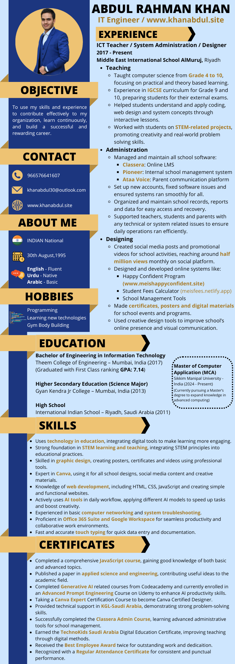 I’m an IT Engineer and Computer Teacher with over 7 years of experience, currently based in Riyadh, Saudi Arabia. I hold a Bachelor’s degree in Information Technology Engineering from Mumbai University and am currently pursuing my Master of Computer Application (MCA) from Sikkim Manipal University.