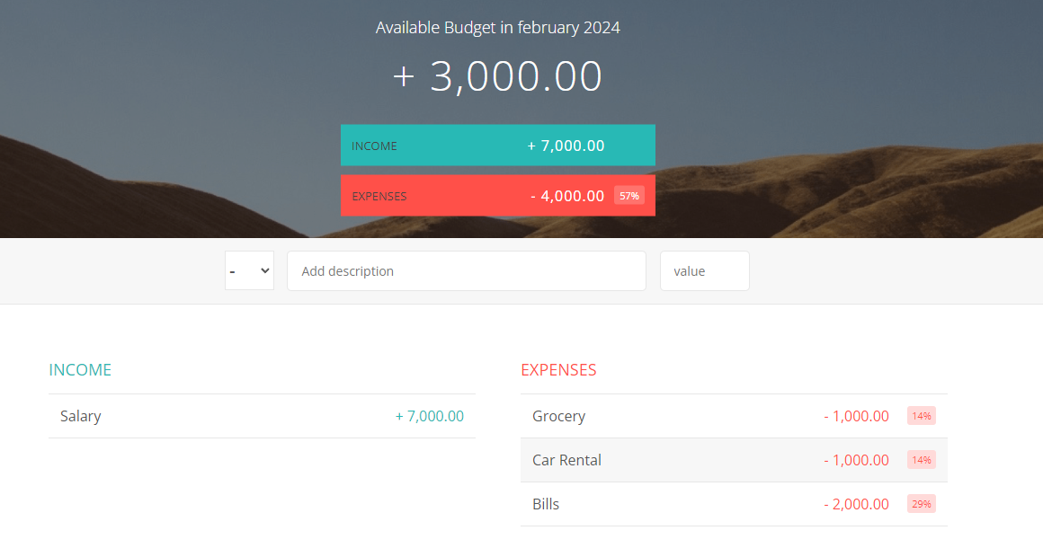 A single page web application designed using pure JavaScript. The application allows you to track your budget by tracking Income and Expense.