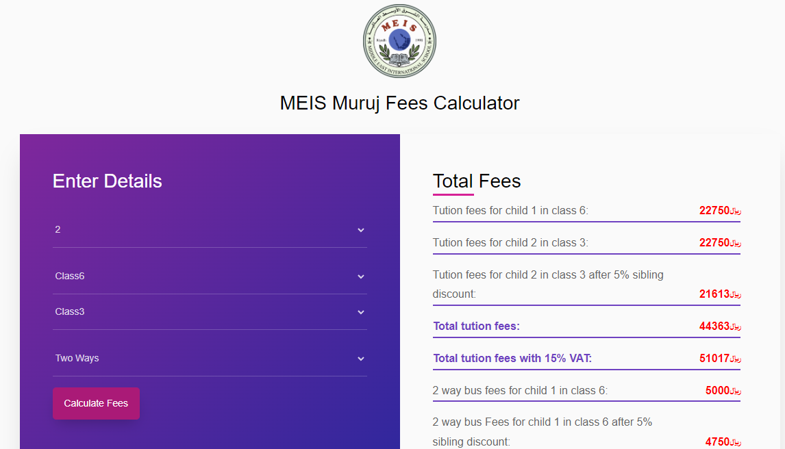 The MEIS School Fees Calculator is a user-friendly tool designed to swiftly compute tuition fees based on the number of students enrolled in each grade level. This intuitive calculator simplifies the process for both administrators and parents.